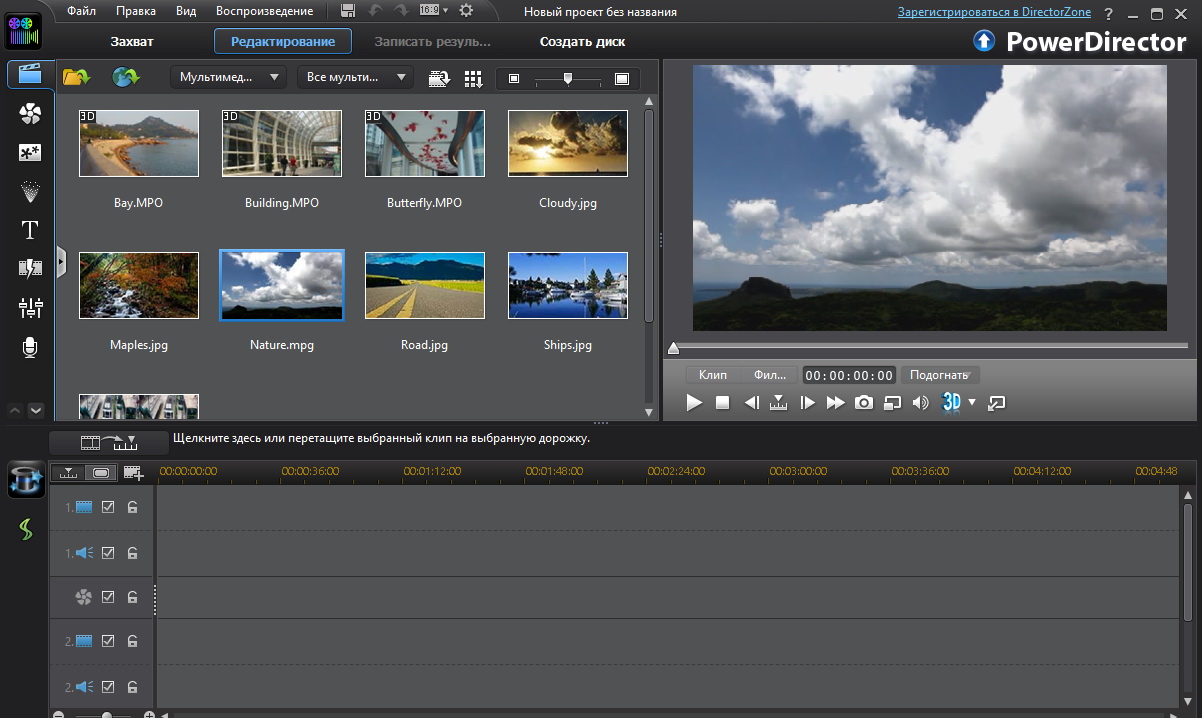 CyberLink PowerDirector Ultra 11.0.0.2812 — профессиональный видеоредактор 2013 года с русским интерфейсом для многодорожечного монтажа Full HD/4K, работы с AVCHD, HDV, MPEG-2, WMV-HD, XDCAM, RED, эффектами в реальном времени, объёмным звуком и записью на DVD/Blu-ray/AVCHD с меню.