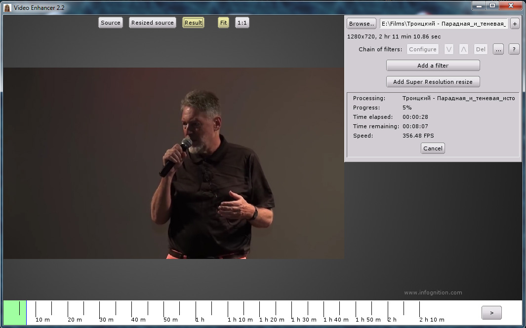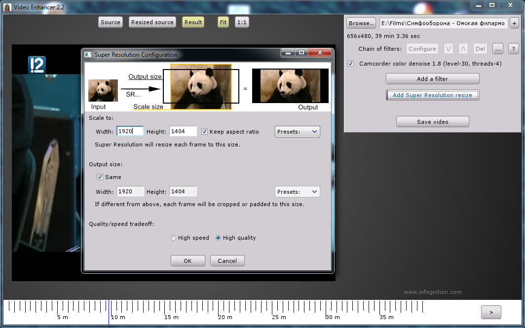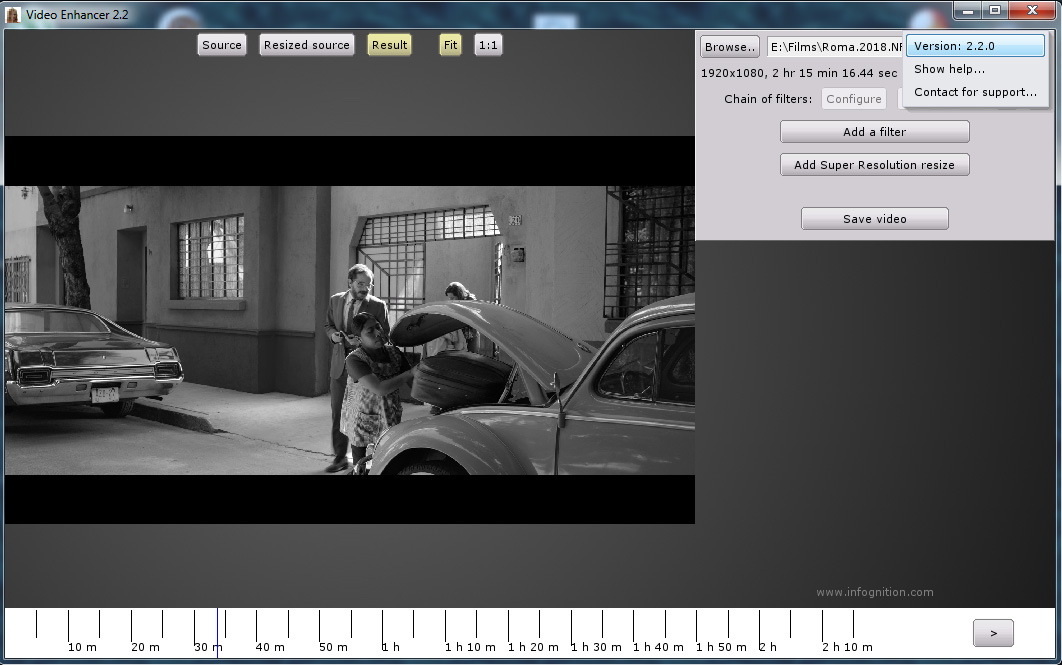 Infognition Video Enhancer 2.2.0 — уникальная утилита 2017 года для настоящего интеллектуального апскейлинга видео с применением технологии Super Resolution, которая анализирует не только текущий кадр, но и соседние, вытягивая из них дополнительные детали и создавая изображение заметно более высокого качества, чем при обычном масштабировании.