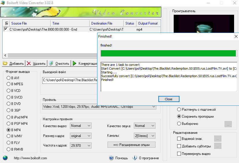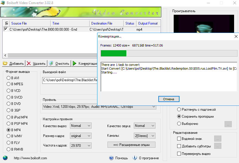 - Boilsoft Video Converter 3.02.8 — конвертация в AVI, MP4, FLV, MOV, WMV, MPEG, VOB, RM, 3GP + субтитры и водяные знаки