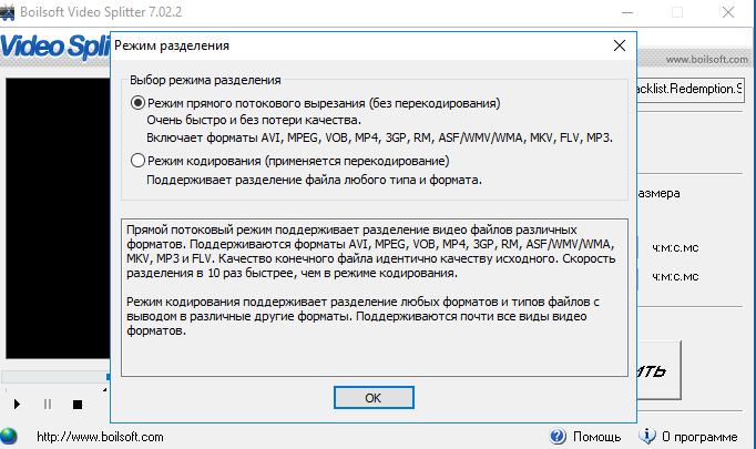 - Boilsoft Video Splitter 7.02.2 — нарезка видео без перекодирования (по времени, размеру, кадрам)