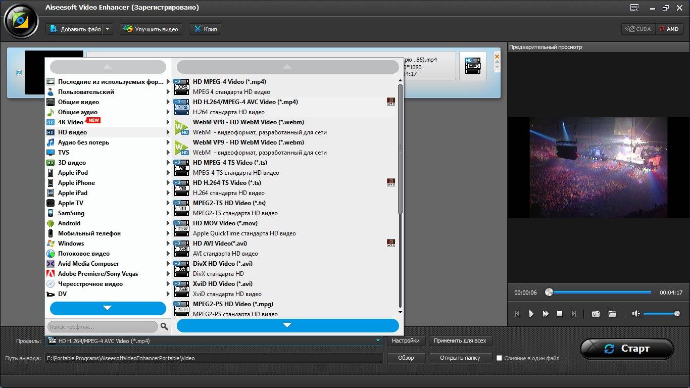 - Поддержка всех популярных форматов входа и выхода: MP4, AVI, MKV, MOV, WMV, FLV, M4V и многих других