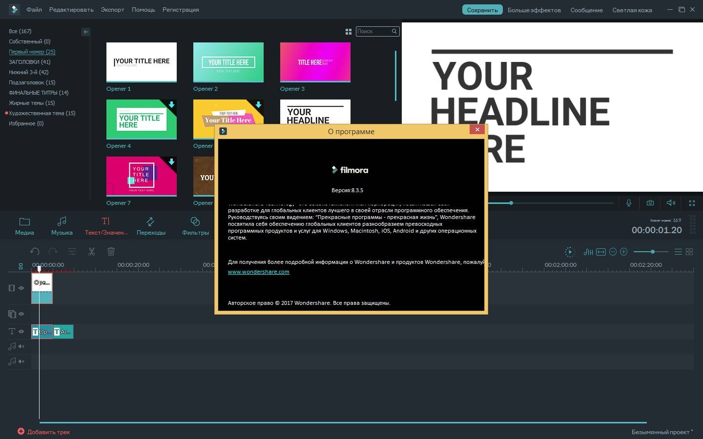 Wondershare Filmora 8.7.0 — удобный видеоредактор 2018 года для создания ярких роликов в Full HD/4K из видео, фото и музыки с помощью простой таймлайны, сотен готовых переходов, фильтров, титров, стикеров, спецэффектов, хромакея, стабилизации, изменения скорости, разделения экрана и наложения аудио.