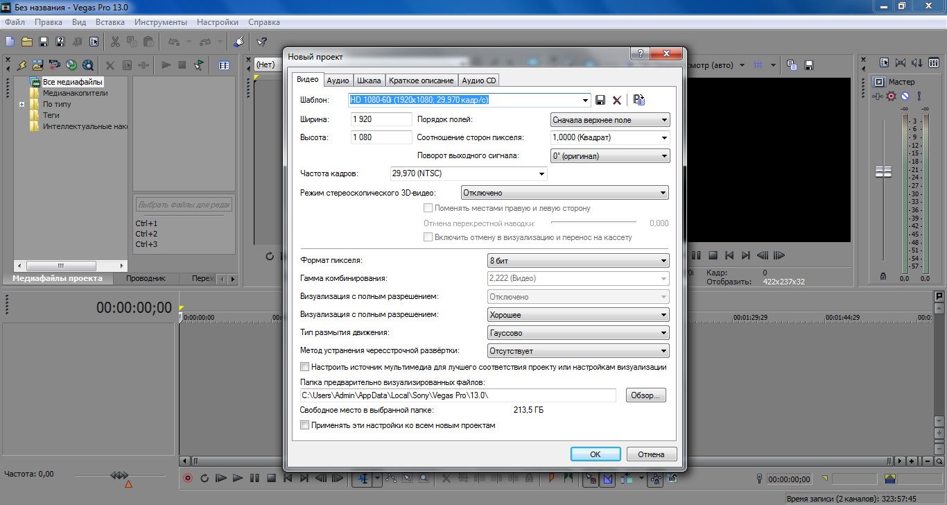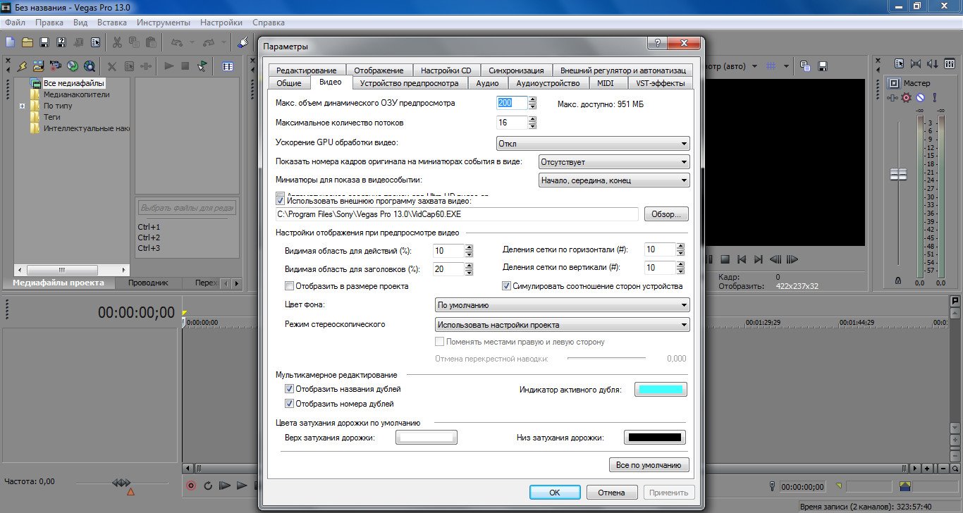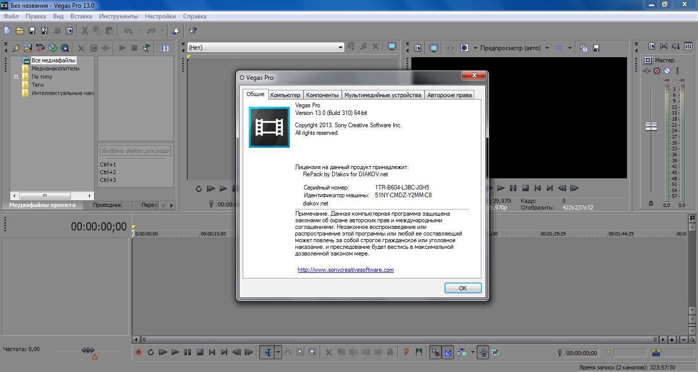 Sony Vegas Pro 13.0 Build 428 — мощный 64-битный профессиональный видеоредактор 2014 года для нелинейного монтажа в реальном времени форматов DV, AVCHD, HDV, SD/HD-SDI, XDCAM и RED .r3d с поддержкой 4K (до 4096×4096), 32-битной обработки с плавающей точкой, объёмного звука Dolby Digital 5.1, создания Blu-ray/DVD с меню через DVD Architect Pro 6.0 и более 190 настраиваемых эффектов (Glint, Rays, Defocus, Starburst, Gradient Wipe и др.).