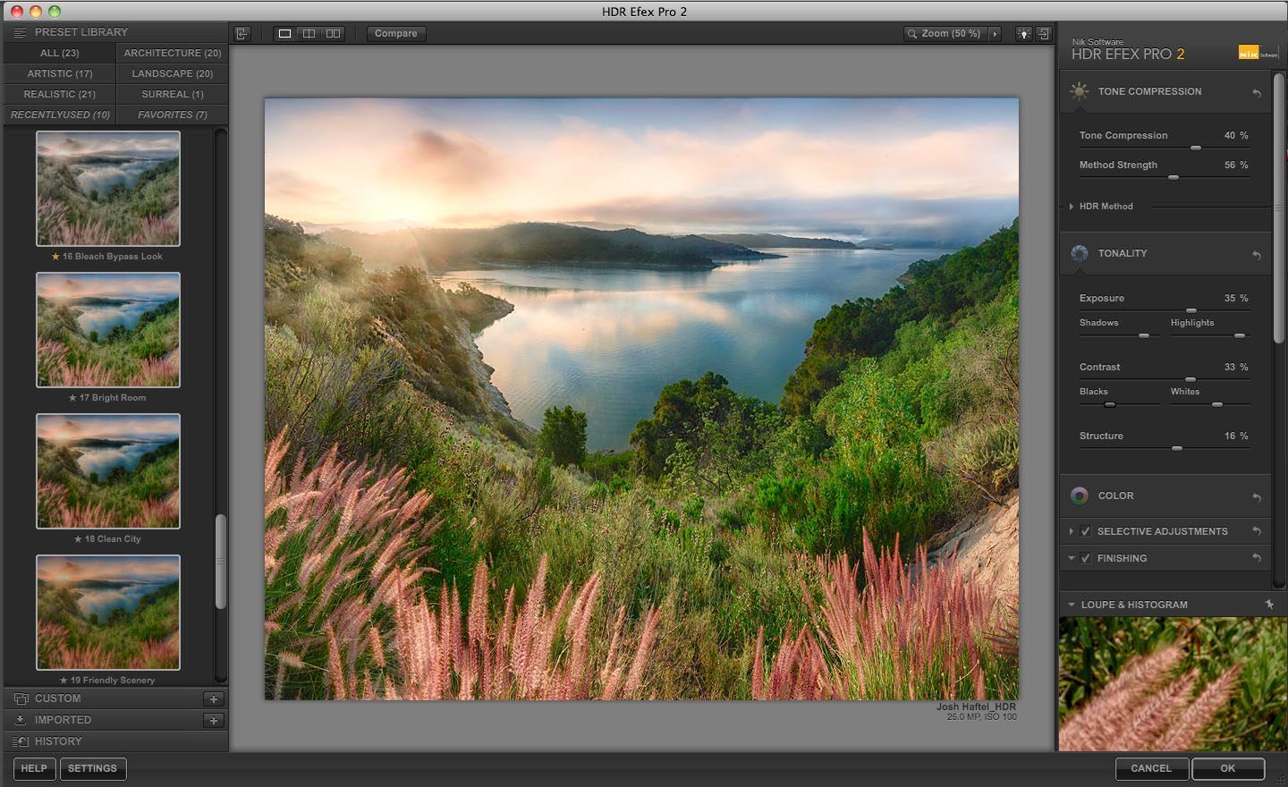 Благодаря интеграции с архитектурой Capture NX2, Color Efex Pro 3.0 позволяет применять эффекты с невероятной гибкостью и точностью. Фотограф может регулировать не только общую силу воздействия, но и яркость, зернистость, тон, а главное — полностью контролировать положение, растяжение и поворот таких фильтров, как градационные и двухцветные. Таким образом, можно найти лучший вариант для сложного пейзажа, работая в спокойной обстановке за компьютером, а не суетясь перед камерой на улице.