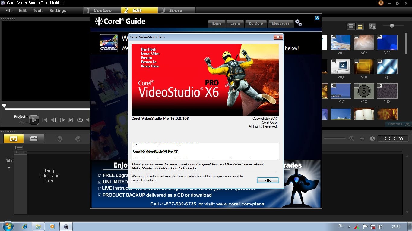 Corel VideoStudio Pro X6 16.0.0.106 — мощный и удобный видеоредактор 2013 года для быстрого монтажа Full HD/4K/UHD с поддержкой всех популярных форматов (AVI, MP4, MOV, AVCHD, MPEG-2/4, H.264, BDMV, MOD, TOD, 3GPP, DSLR-покадровая съёмка), 21 мультимедийной дорожкой, Motion Tracking, стоп-моушен анимацией, покадровой анимацией, ускорением/замедлением, хромакеем, субтитрами, HTML5-экспортом и записью на DVD/Blu-ray с меню.