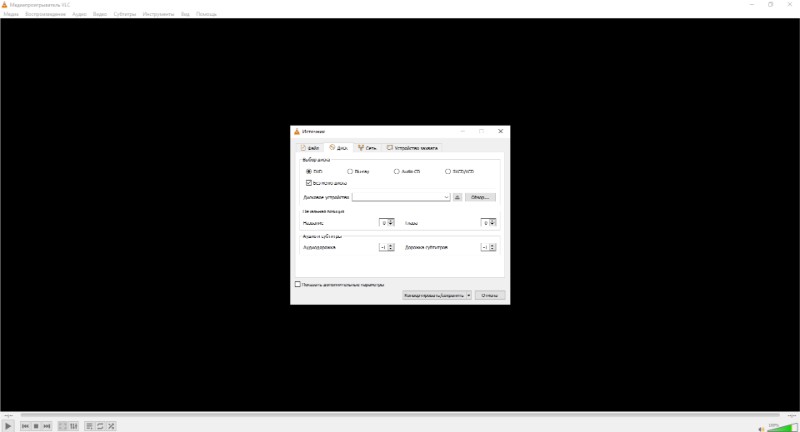 - 1. Открытие диска. Запустите VLC, в меню выберите пункт для открытия носителя и нажмите Open Disc.