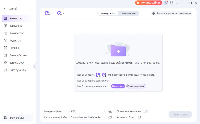 - 1. Выбор инструмента. Запустите программу и перейдите в раздел «Конвертер».