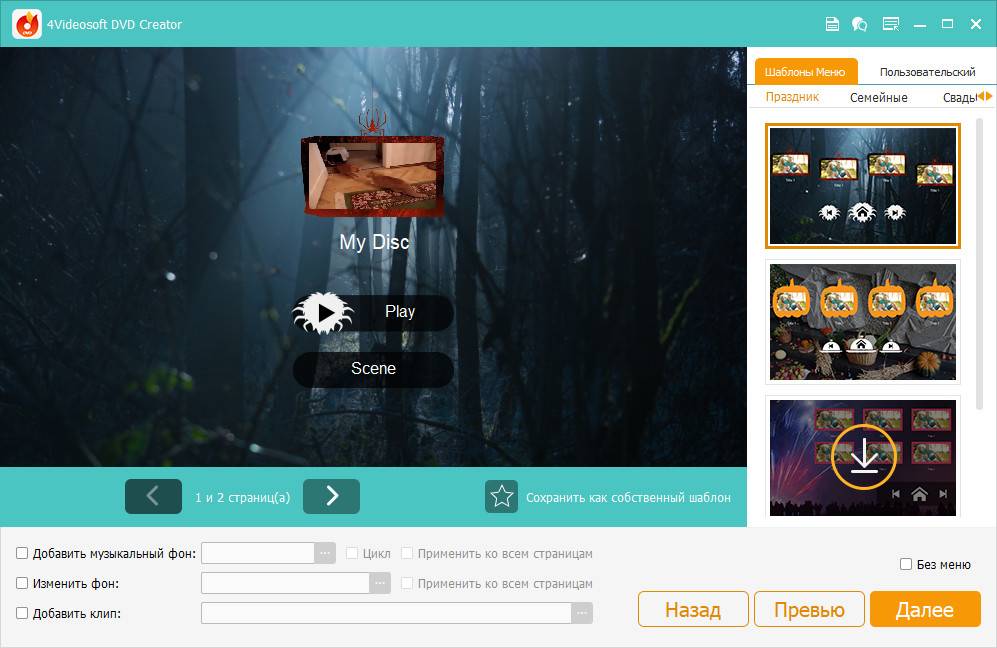 4Videosoft DVD Creator 6.1.12 — удобный инструмент 2017 года для создания DVD-дисков из популярных видеоформатов AVI, MPEG, DivX, TS, MTS, DV, VOB, WMV, MP4 с возможностью записи DVD-папок/ISO-образов, настройки меню с шаблонами, фоновой музыкой/картинкой, добавления аудиотреков/субтитров и редактирования видео эффектами/обрезкой/водяными знаками.