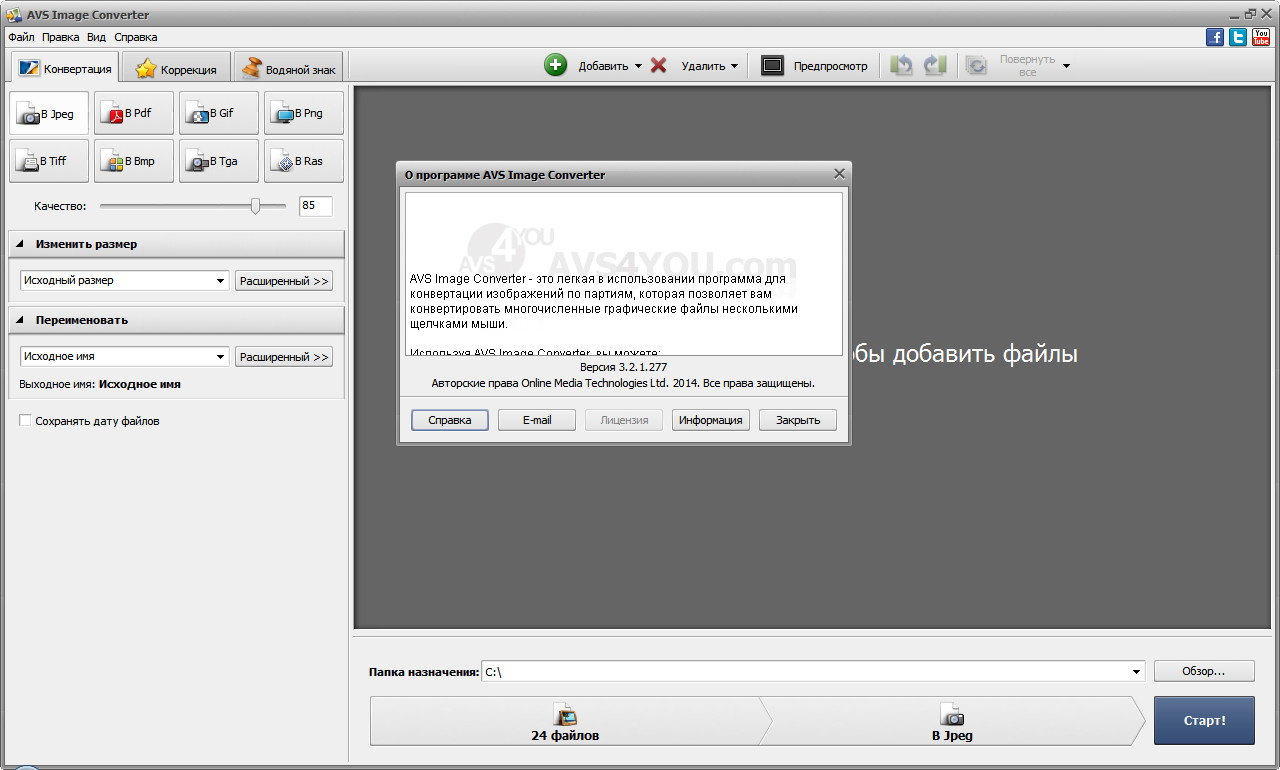 - AVS Image Converter конвертирует/редактирует графические файлы с эффектами/водяными знаками текст/графика/старением/чёрно-белым/пресетами размера