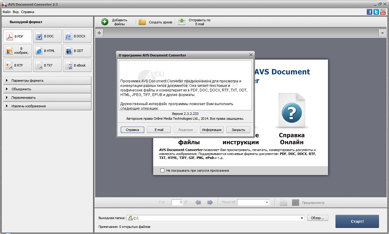 - AVS Document Converter просматривает/конвертирует текстовые/графические файлы в PDF DOC DOCX RTF TXT ODT HTML JPEG TIFF EPUB с защитой паролем/ограничениями/водяными знаками/ZIP архивацией