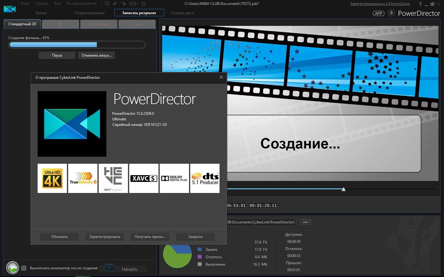 CyberLink PowerDirector Ultimate 15.0.2509.0 — динамичное решение для монтажа видео высокого уровня с ускоренной обработкой благодаря TrueVelocity 3/поддержкой многоканального аудио до 7.1/импортом/экспортом 2K/4K Ultra HD для формирования выразительных проектов с интеграцией AudioDirector/ColorDirector/PhotoDirector для всесторонней доводки контента с профессиональными инструментами/эффектами/переходами/титрами.