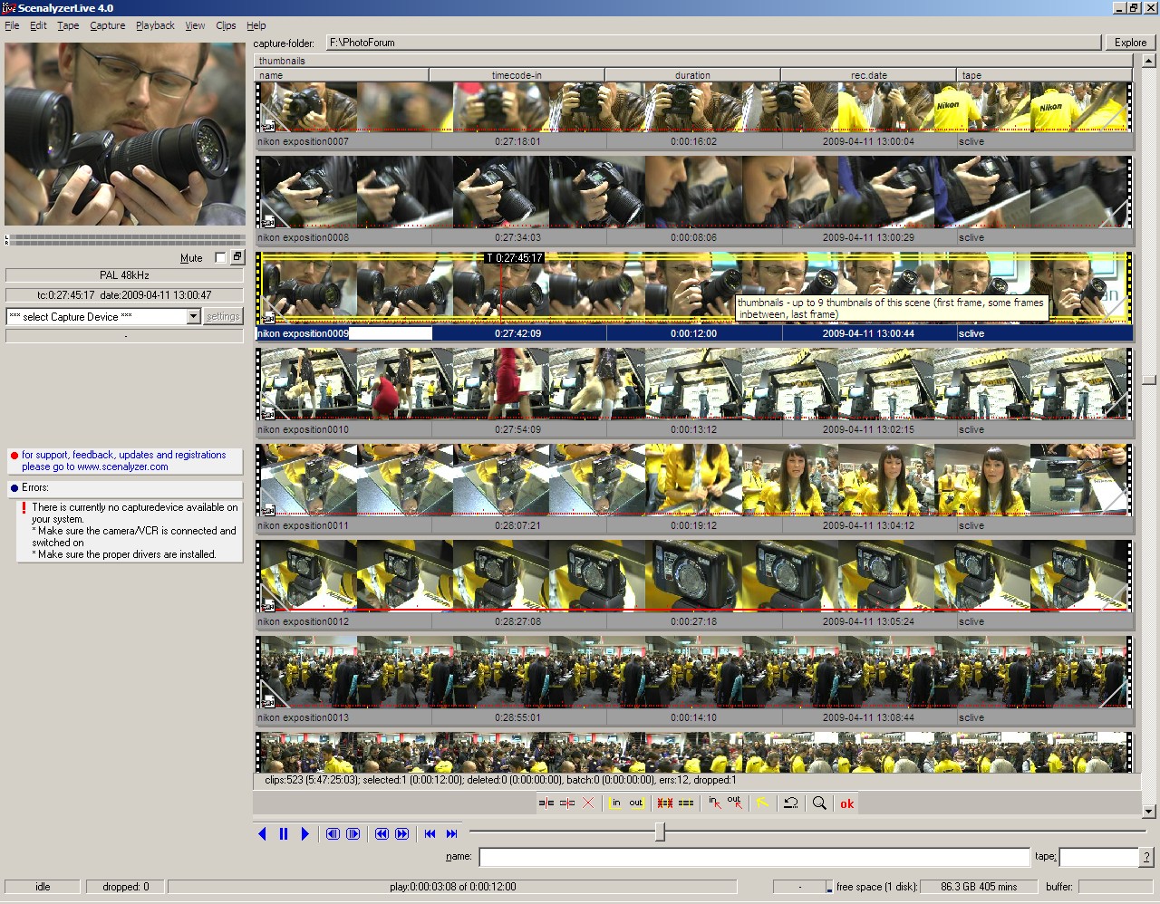 ScenalyzerLive 4.0 — специализированная утилита предназначенная для захвата DV видео с камер с автоматическим разбиением записи на отдельные сцены по обнаружению остановок камеры через таймкод для удобного последующего монтажа/хранения материалов с обходом ограничений FAT32 в 4 ГБ путём разделения потока на файлы заданного размера для непрерывной работы без прерываний на старых системах с точной записью обратно на ленту включая имена файлов для лёгкого восстановления проектов на камере даже на компьютерах с не самыми быстрыми дисками где другие редакторы справляются хуже.