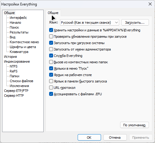 ● Настройка параметров во время установки. Перед установкой Вы можете выбрать настройки приложений и место хранения данных, а также настроить службу и задать сервисный порт. Опционально пользователь может запустить приложения с правами администратора устройства или отключить индексацию дисков NTFS. Программа предлагает запускаться при каждой загрузке Windows до дальнейшего уведомления, но данную опцию можно отключить перед установкой или позже на панели настроек. Утилита может ассоциировать себя с собственным расширением файлов EFU (Everything File Lists) и автоматически индексировать разделы NTFS. Более того, Вы можете интегрировать Everything в контекстное меню Проводника Windows для быстрого сканирования папок.