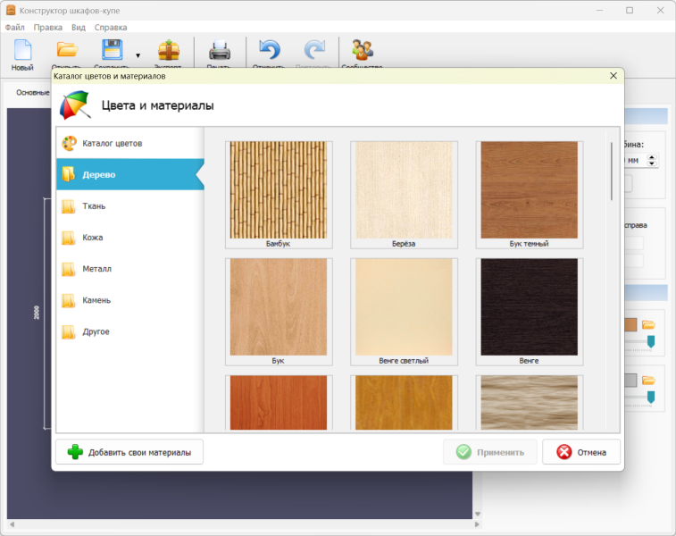 ● Коллекция материалов: выбирайте текстуры дерева, ткани, кожи или металла. Для корпуса, дверей и задней панели можно установить разные варианты отделки.