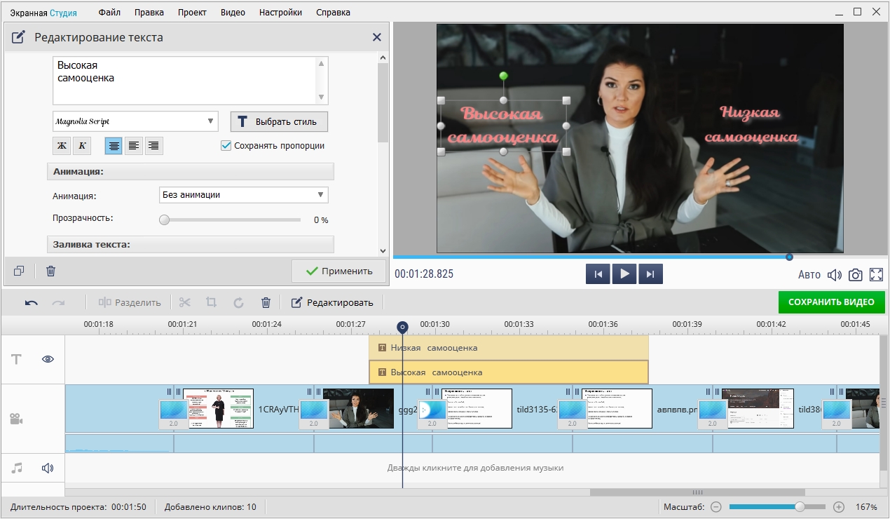 Редактор «Экранной Студии» позволяет легко обрезать ненужные фрагменты или объединить несколько клипов в один проект. Работать можно прямо на временной шкале, используя мышь и контекстное меню. Предусмотрен инструмент точного позиционирования, позволяющий вырезать фрагменты с точностью до кадра.