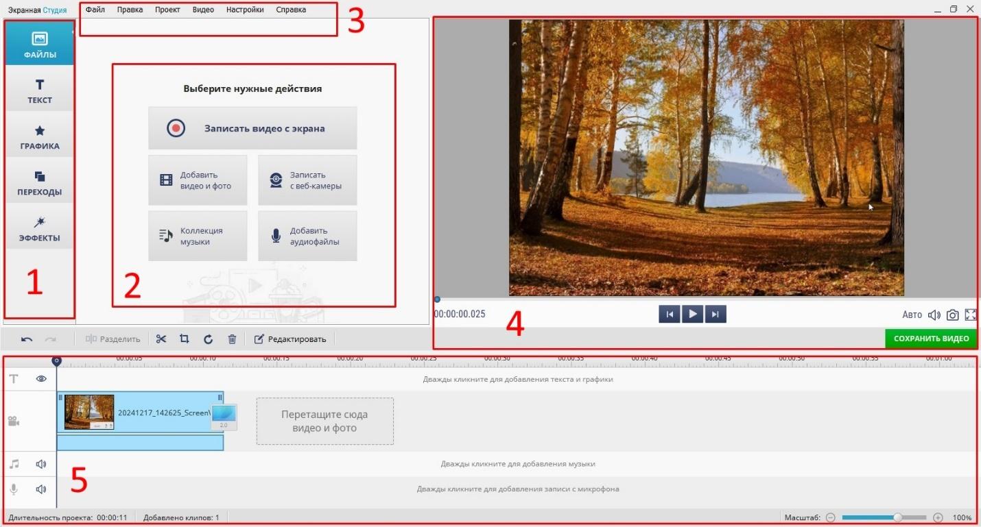 Интерфейс программы «Экранная Студия» выполнен в классическом стиле и напоминает видеоредакторы начального уровня, где акцент сделан на доступность и простоту. Главное окно содержит три основных блока: панель управления, область предпросмотра и временную шкалу. Все элементы расположены логично, что позволяет начать работу сразу после установки.