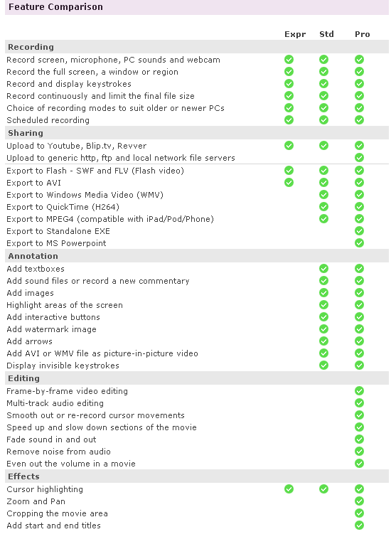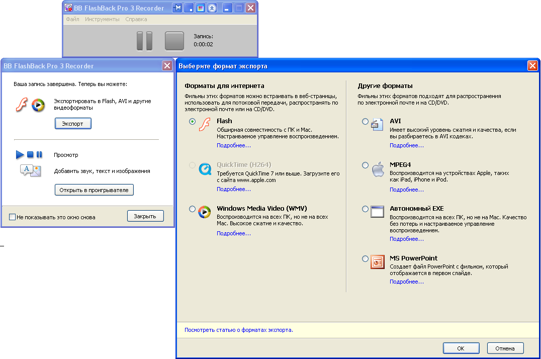 Экспорт во множество форматов. Flash, QuickTime, AVI, WMV. В редакции Pro — автономные EXE.