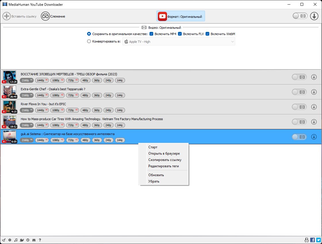 MediaHuman YouTube Downloader предназначен для быстрого скачивания видео и аудио с YouTube и множества других сервисов. Программа позволяет сохранять видео в оригинальном качестве или извлекать только звук. Поддерживается загрузка целых плейлистов, каналов и даже слежение за обновлениями — новые видео автоматически добавляются в очередь. Интерфейс прост и понятен, поддерживает перетаскивание ссылок (drag&drop) и интеграцию с iTunes/Music.app. Пользователи могут выбрать нужное разрешение (720p, 1080p, 4K, 8K) и частоту кадров (30 или 60 fps), а также авторизоваться для скачивания закрытых или ограниченных видео.