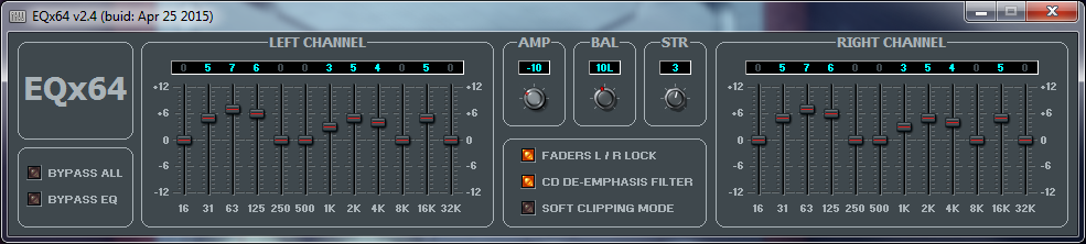 EQx64 2.4 Build Apr 25 2015 — профессиональный 12-полосный стерео эквалайзер двойной точности (64/80-bit floating point internal processing), созданный российским разработчиком Владимиром Дятловым специально для Winamp 2.x и выше, а также для foobar2000 через специальный мост. Плагин полностью заменяет штатный эквалайзер Winamp, обеспечивая аудиофильское качество обработки звука с минимальными шумами и искажениями, точно имитируя поведение высококлассных аналоговых эквалайзеров студийного уровня. Каждая полоса имеет ширину ровно одну октаву, регулировку усиления в диапазоне ±12 дБ с шагом 0.1 дБ, независимые фейдеры для левого и правого каналов с возможностью синхронизации (LOCK L/R FADERS), режим мягкого насыщения Soft Clipping для предотвращения клиппинга, регулировку баланса, предусиления, усиления стереобазы (STR), фильтр CD de-emphasis и два режима обхода (BYPASS ALL и BYPASS EQ). Поддерживает любые частоты дискретизации и разрядность входного сигнала (8/16/24/32 бит), отображает точный график АЧХ в реальном времени, позволяет сохранять и загружать неограниченное количество пресетов, быстро сбрасывать ползунки правой кнопкой мыши или устанавливать все полосы одновременно на фиксированные значения (+12/+6/0/-6/-12 дБ). Обработка написана на ассемблере с максимальной оптимизацией, что обеспечивает сверхнизкий уровень собственного шума и высочайшую точность даже на слабых ПК.